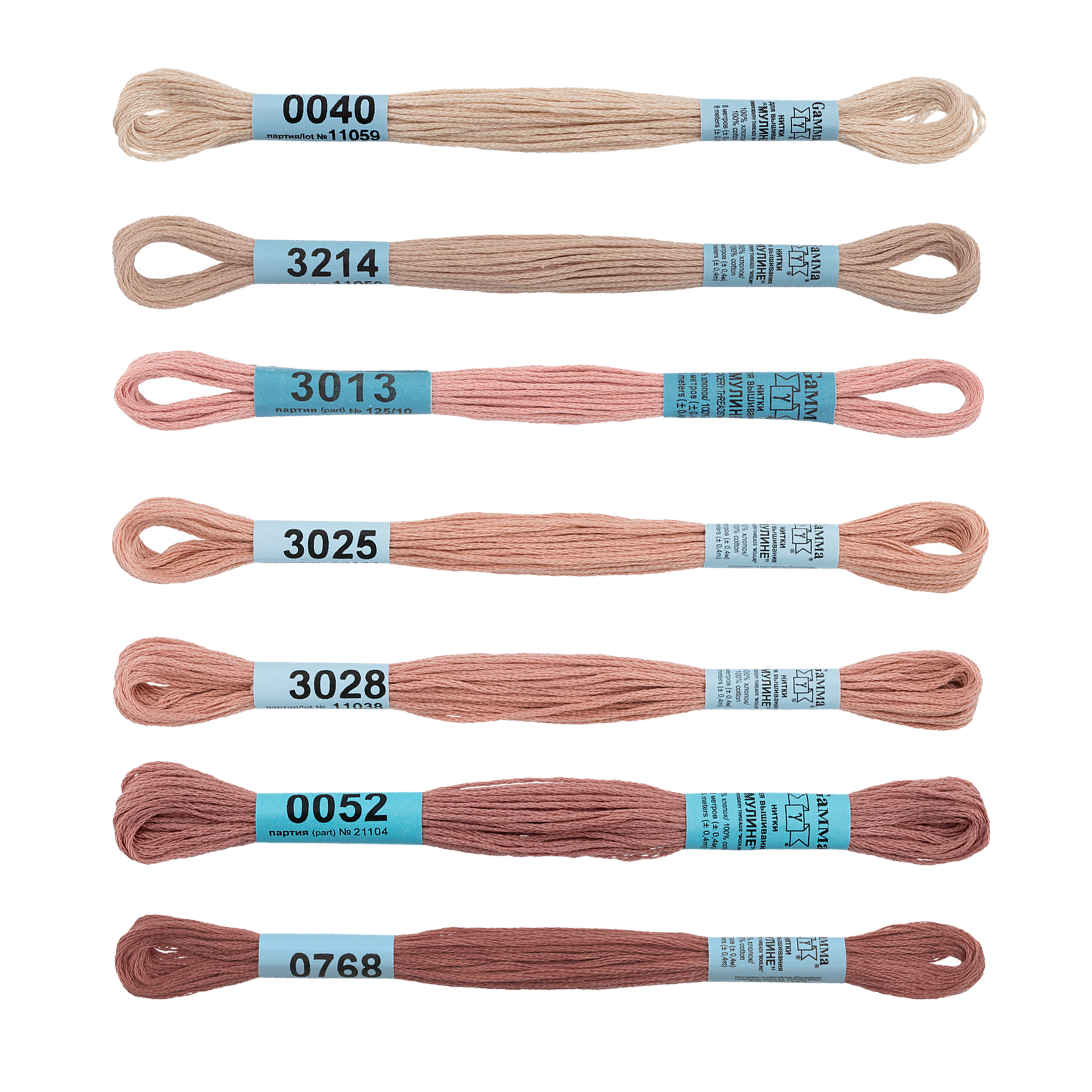 В набор ассорти "СПЕКТР" входит 7 мотков по 8 м одной цветовой палитры, но разных оттенков, позволяющие сделать плавный переход цвета в вышивке.