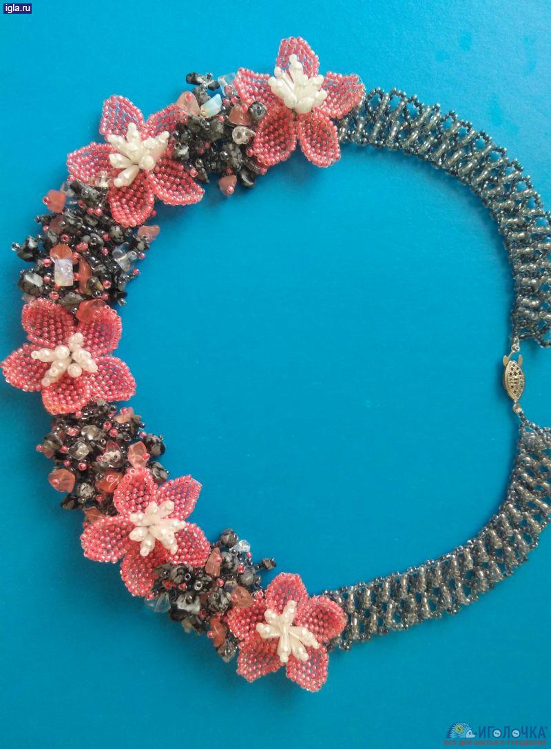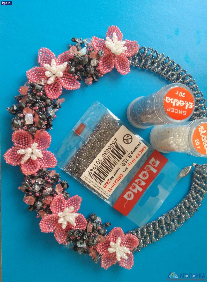 Сетка-основа выполнена из бисера Zlatka 2210-11. Цветы - розовый бисер, каплевидные бусины производитель не известен.