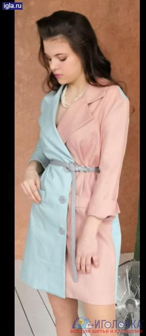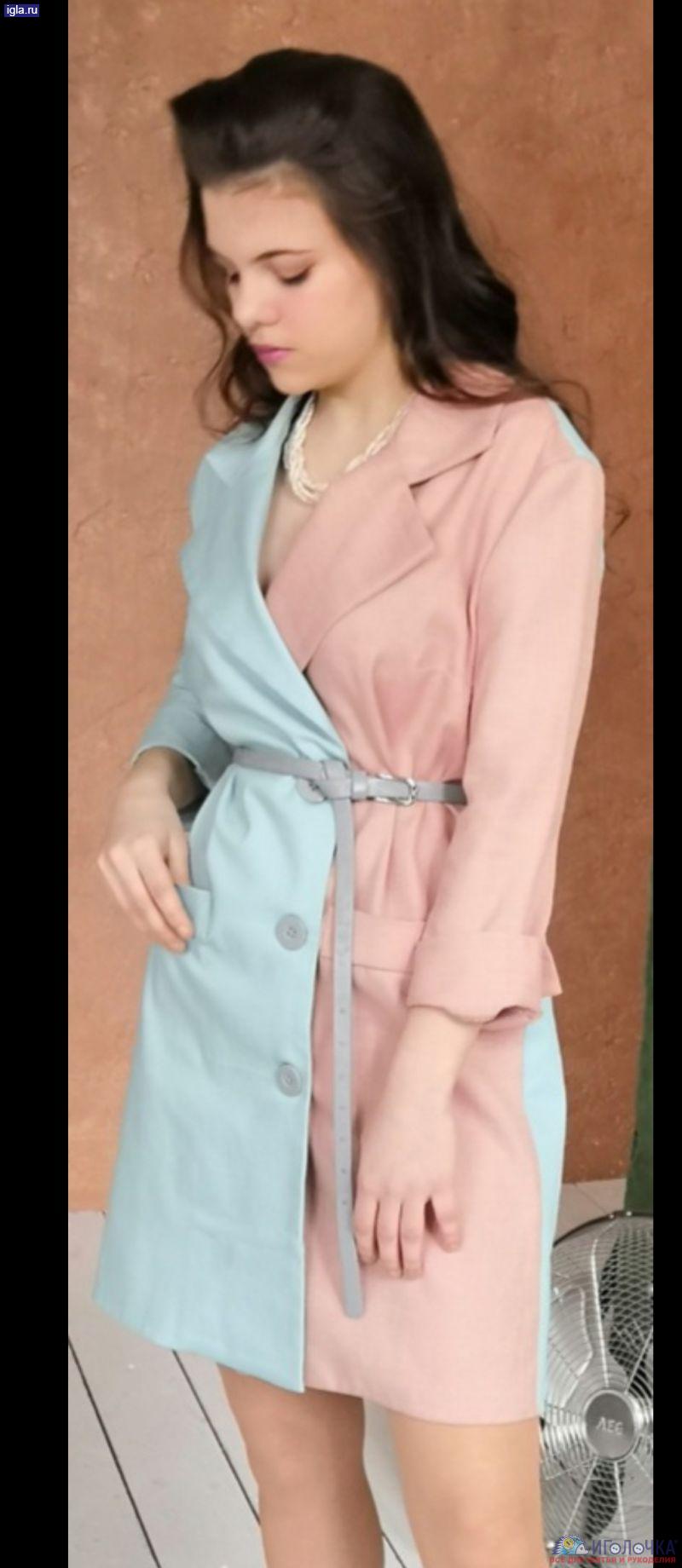 Платье в классическом крое. Выполнено в пастельных тонах. Ткани разной фактуры которые хорошо сочитаются между собой (лен,джинса со стрейчем). Образ дополняют пуговицы и ремешок одного светло-серого цвета. Также есть карман-обманка в виде листочки. В рукав втачины манжеты,идущие внахлёст. Воротник классический английский. Длина изделия до колена. Нагрудная выточка переведена в бок.