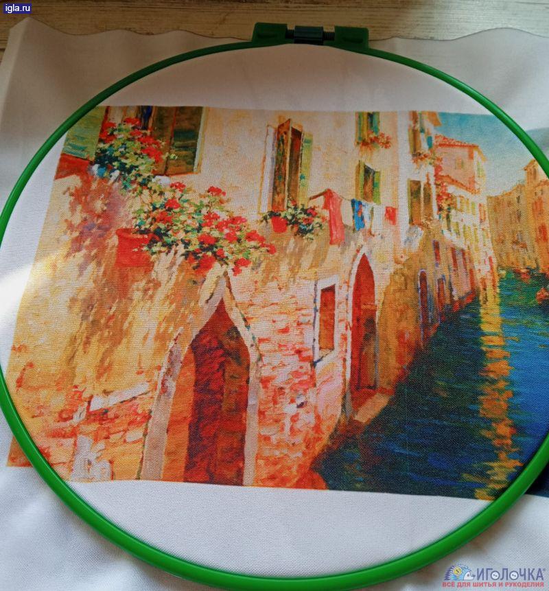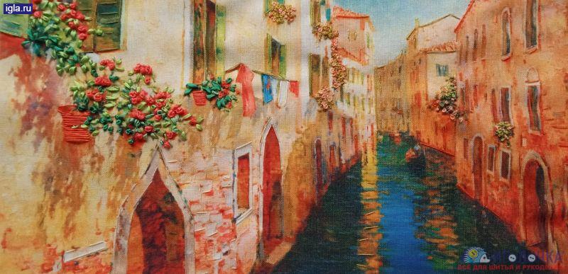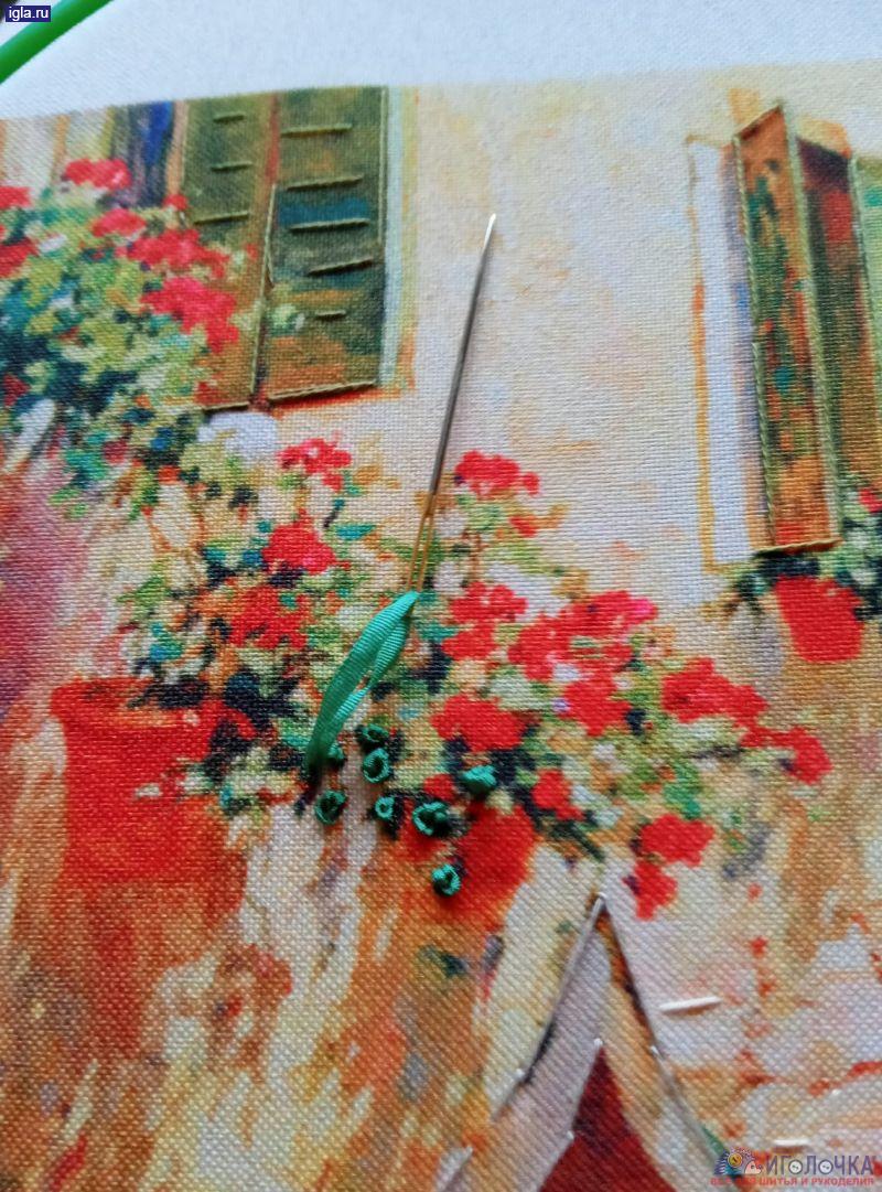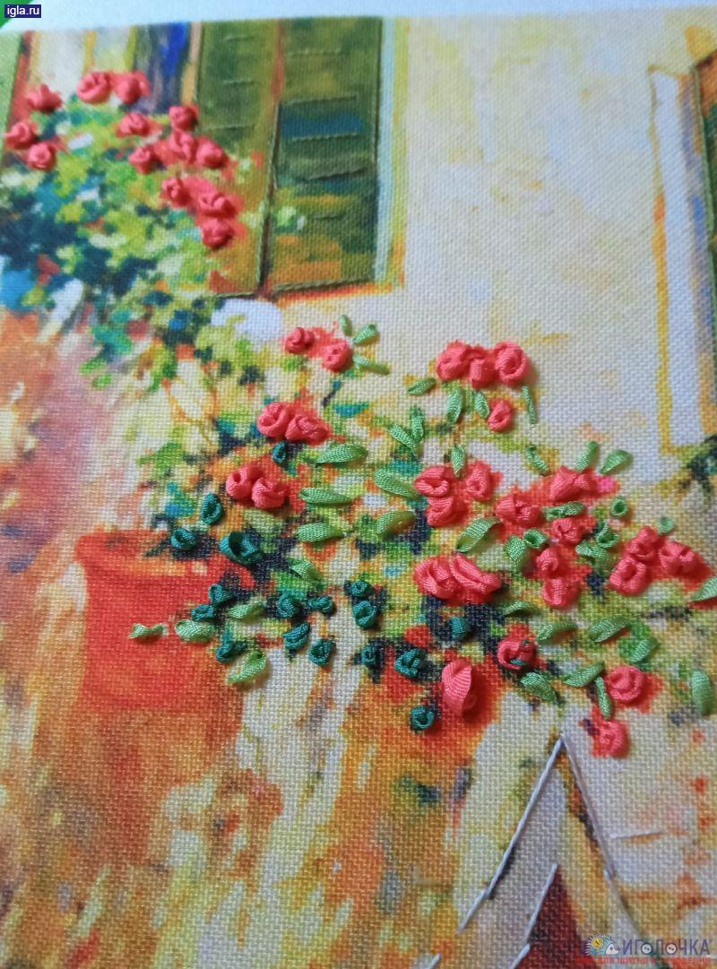 Работа вышита шелковыми лентами и нитками мулине на габардине с напечатанным рисунком . Для работы использовался набор из коллекции ,,Живая картина " PANNA .