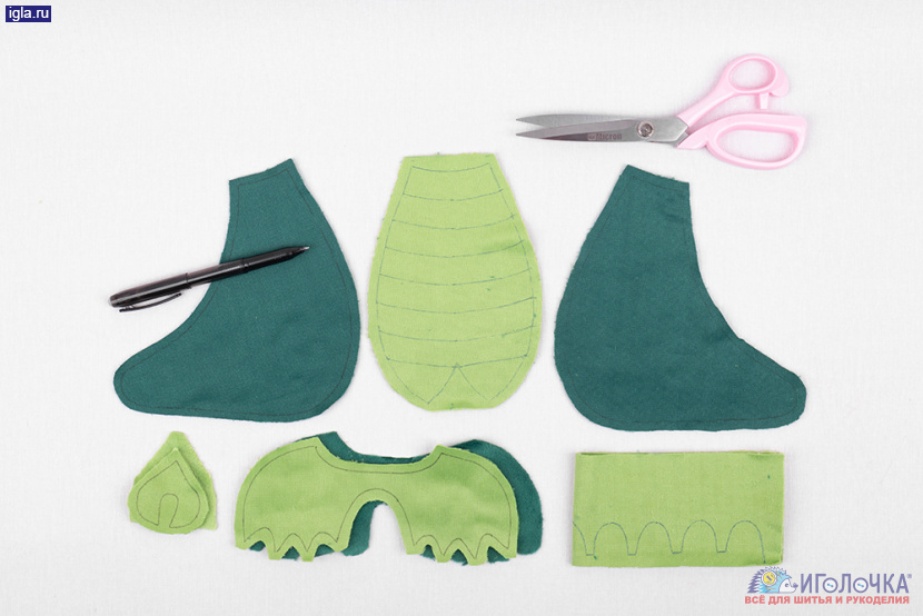 2. Также из тёмно-зелёного плюша выкраиваем боковые детали туловища. Животик, гребень и пика на хвосте будут светло-зелёного цвета. Крылья делаем двусторонние: подготавливаем одну деталь из тёмного и одну из светлого плюша. Переносим с лекал все вспомогательные линии. Отмечаем на заготовках промежутки, которые останутся незашитыми – они нужны для того, чтобы игрушку можно было набить синтепоном.